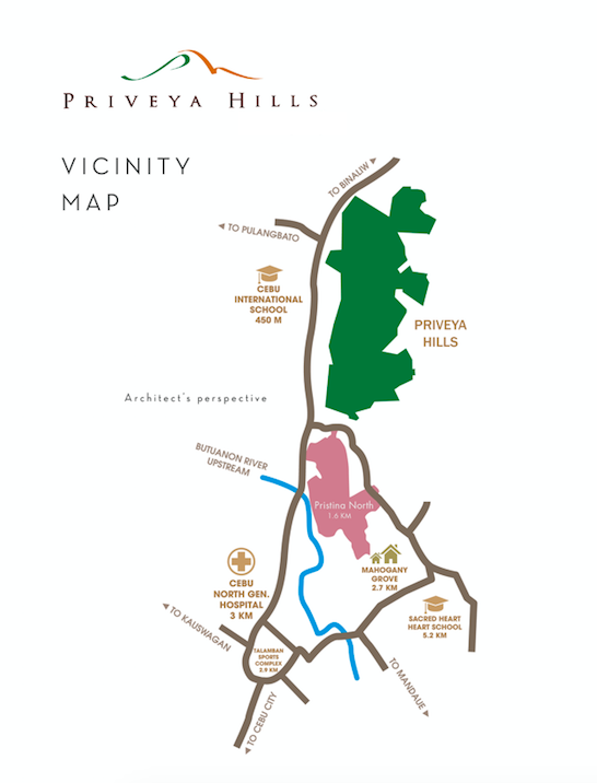 Located in the valleys of Bacayan, Cebu,Priveya Hills is only 15 - 20 minutes from Cebu City and Mandaue City and about a minute away from AboitizLand's Pristina North. It is close to Ateneo de Cebu, Cebu International School, Cebu North General Hospital and other establishments.